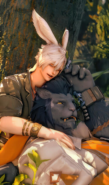 "From dusk to dawn, you are always by my side."Ame met the dark-furred Hrothgar known as Onyx when he was injured on his travels through Ilsabard. Onyx, much like many Hrothgars, was a tradesman, who was particularly fond of botany and had dreams of becoming an apothecary.Onyx shares Ame's thirst for adventure and eventually left his own home to become his companion and eventually his lover.While Ame is aloof and stoic, Onyx is gentle, naive, and empathetic.The two would return to Bozja to assist the Resistance with their restoration efforts."Please, take me with you. I promise I won't be a burden. All I've ever wanted was to see the flowers that blossom on the edges of the world." - Onyx.
